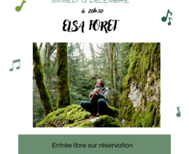 Concert à La Tuilerie à St Joseph de Rivière avec « ELSA FORET », le Samedi 13 décembre, à 20h30. Entrée au chapeau, réservation obligatoire par mail à echo.alpin@laposte.net. L’Echo Alpin