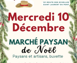 Le CAP (Chartreuse Alimentation Paysanne) vous propose son marché paysan de Noël sur le marché du mercredi à Saint Laurent du Pont. Devant les Halles de Chartreuse , route des Echelles à St Laurent du Pont. Mercredi 10 décembre De 16h à 19h Producteurs bio et locaux Artisans locaux Vin chaud