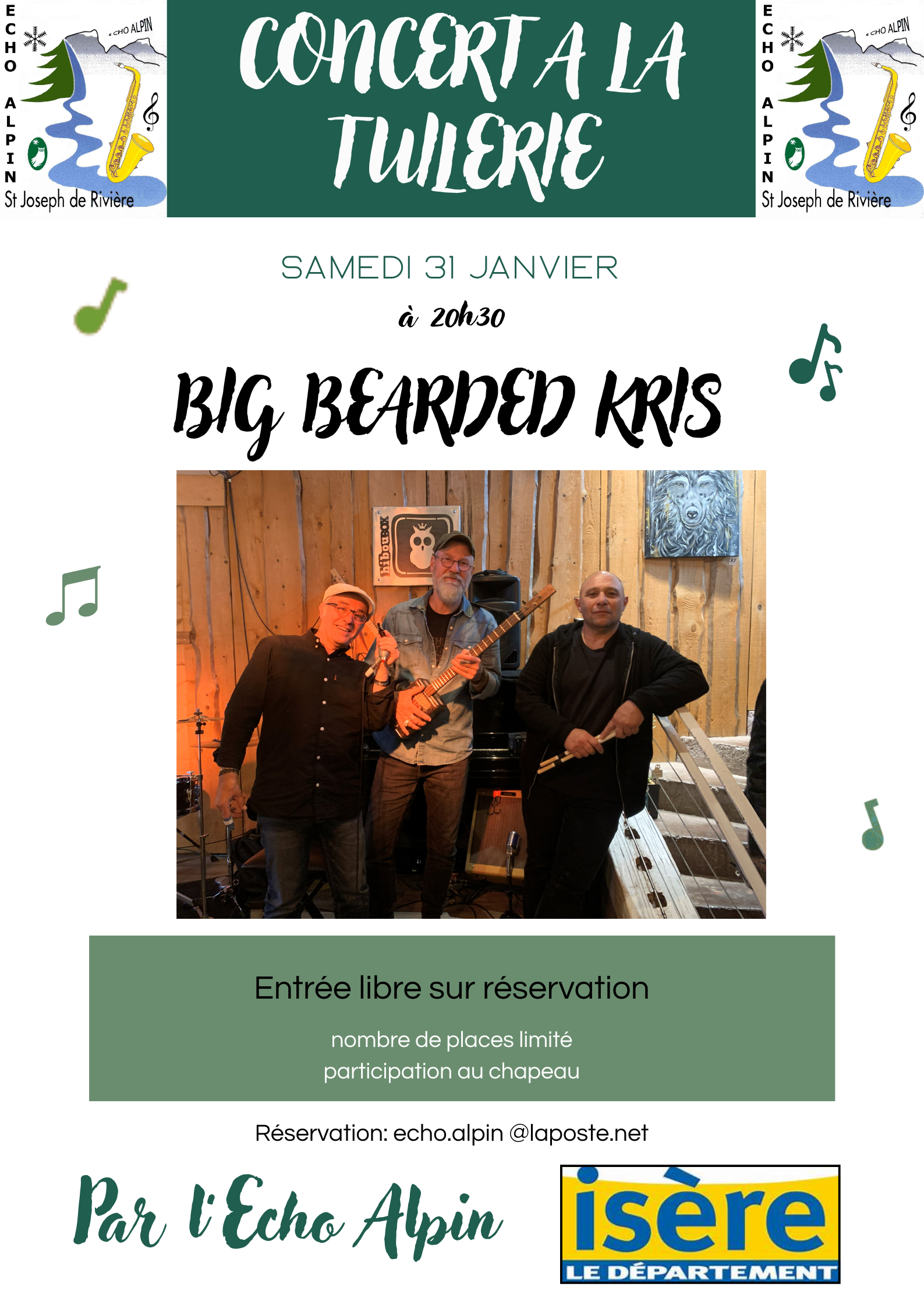 Concert à La Tuilerie à St Joseph de Rivière avec « BIG BEARD KRISS », le Samedi 31 Janvier, à 20h30.