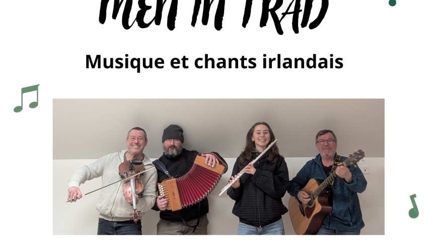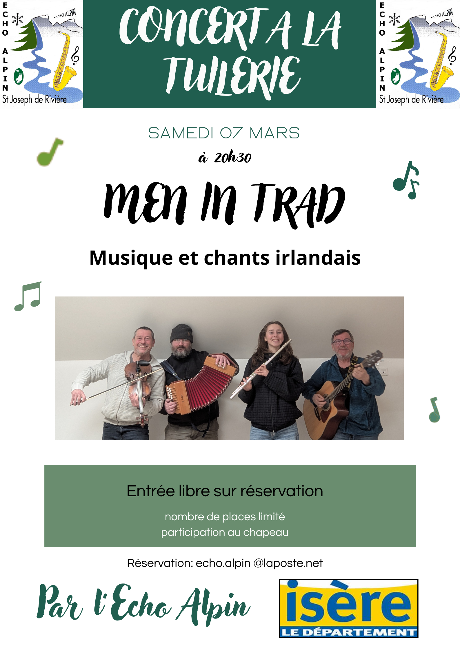 Concert à La Tuilerie à St Joseph de Rivière avec « MEN IN TRAD », musique et chants irlandais, le Samedi 07 mars, à 20h30. Entrée au chapeau, réservation obligatoire par mail à echo.alpin@laposte.net.
