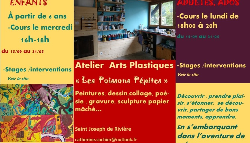 L’Atelier d’arts plastiques: peinture, dessin, sculpture papier mâché, gravure… Les Poissons Pépites proposent des cours enfants et adultes à Saint Joseph de Rivière