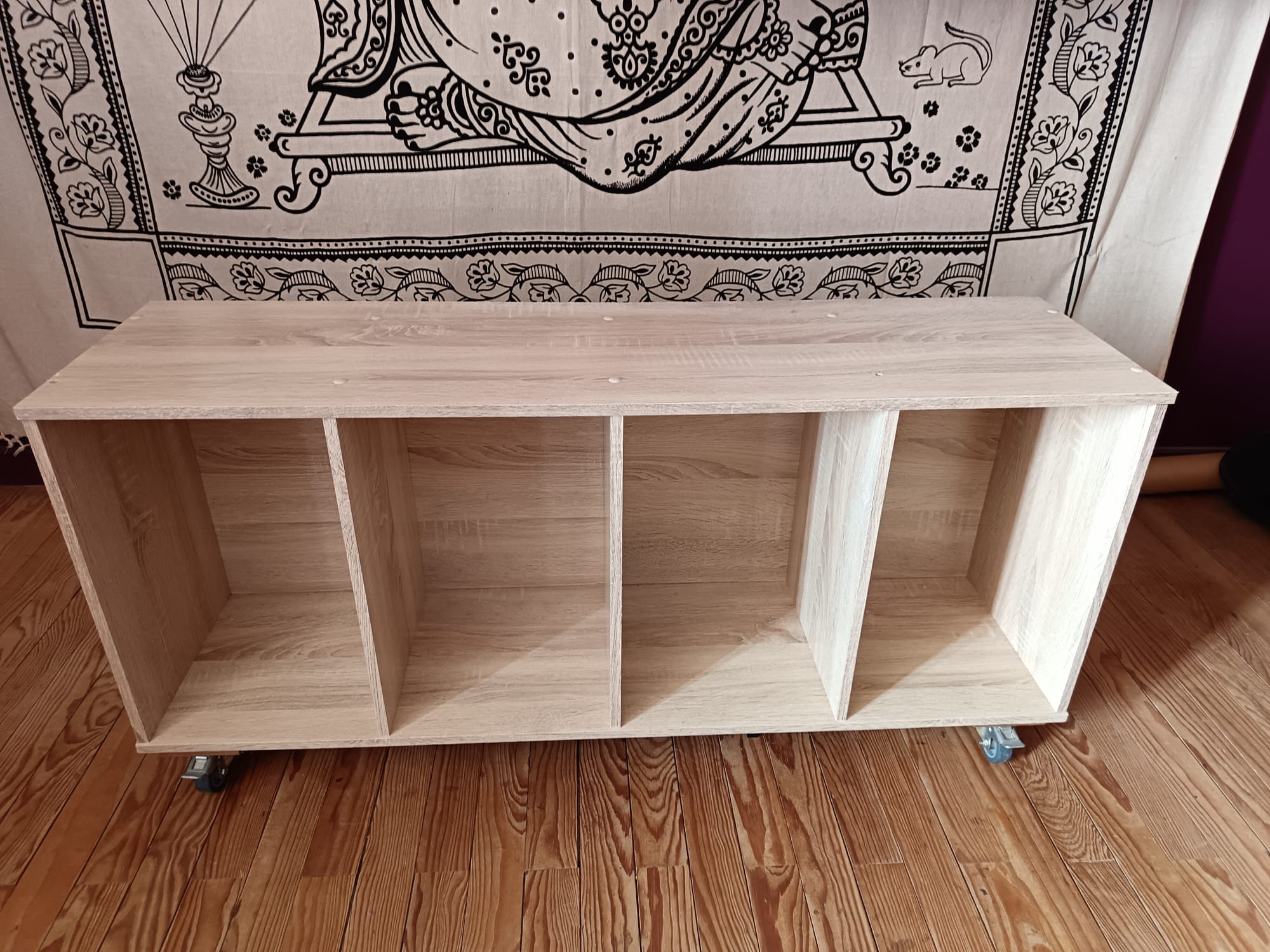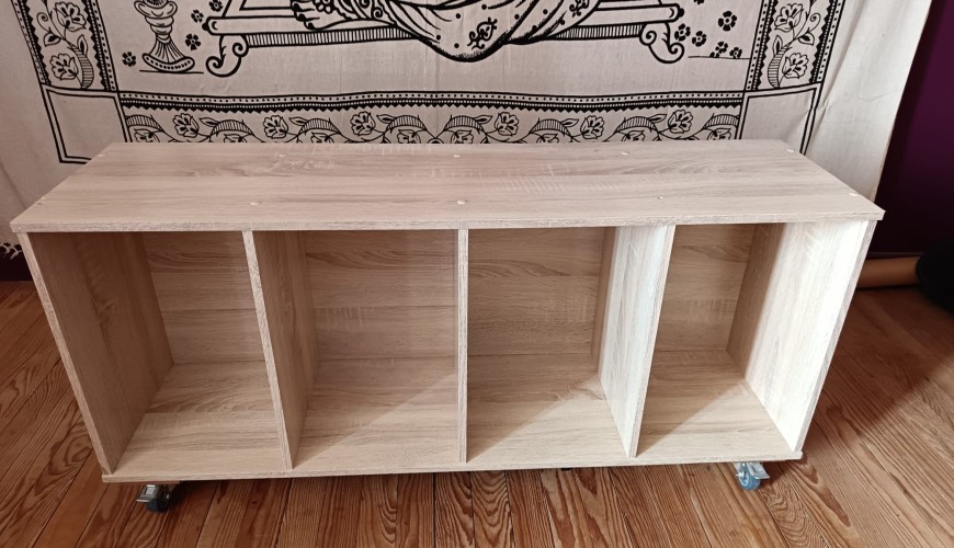 Donne petite étagère en bon état en mélaminé type bois gris, transformée en meuble à roulette. Elle est équipé de 4 roulettes dont deux à freins. Voici ces dimensions: Hauteur 51cm Profondeur 30 cm Largeur 106.5m PAS D’ENVOI, à venir chercher Je reste dispo pour toute demande d’info Bien belle journée