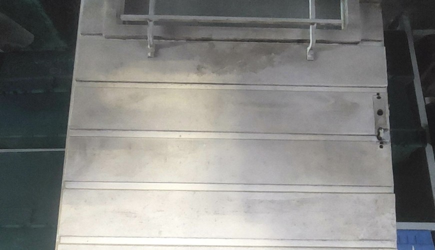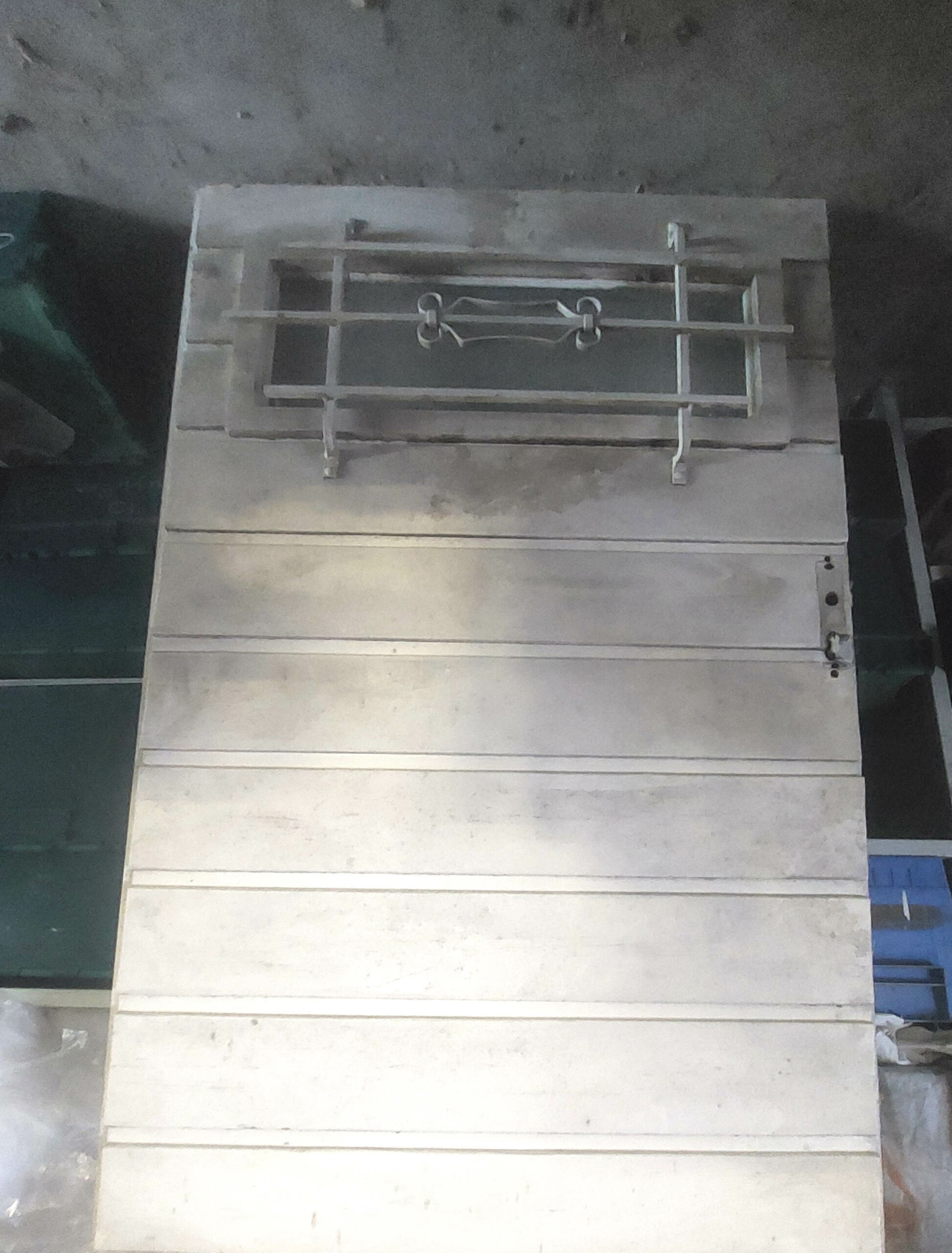 Donne une porte pleine en bois avec petite fenêtre protégée par fer forgé. Porte épaisse d’entrée depuis l’exterieur.