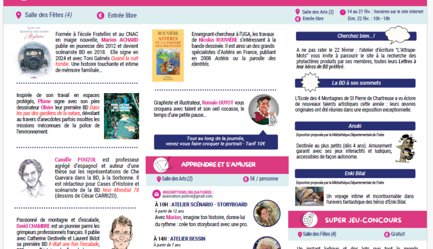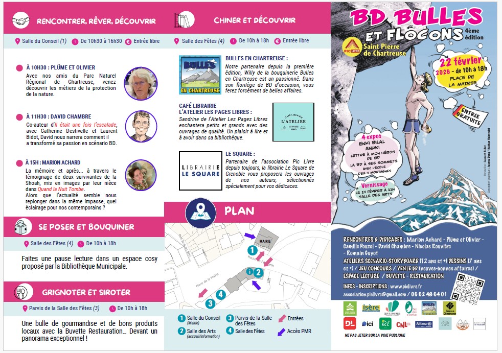 Le dimanche 22 février Saint Pierre de Chartreuse se met à l’heure de la BD. Des rencontres avec des auteurs, des dédicaces, des libraires neuf et occaion, des jeux-concours, des ateliers de lecture, des expositions (des planches d’Enki Bilal, mais aussi une exposition interactive destinée aux tout petits à partir de la BD Anuki). Sauf les ateliers de dessin (avec Olivier: pour des jeunes de 7 à 77 ans) et scénario (avec Marion Achard: pour des enfants de plus de 10 ans et adolescents) (prix: 5 euros sur inscription), toutes les activités sont gratuites. Du matin (10 heures) à l’a fin de l’après midi (18 heures) venez découvrir des thématiques comme les liens entre le football et la politique, l’histoire de l’escalade, la protection de la Nature dans les Parcs Naturels, ou encore la mémoire de la Shoah.